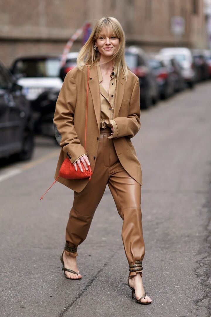 キャメル、ブラウン、赤で構成する優しい暖色コーディネートは、レザーパンツのスパイスでモード感をひとさじ。パンツの裾をラップストラップサンダルで絞り、足元をきりっと引き締め。