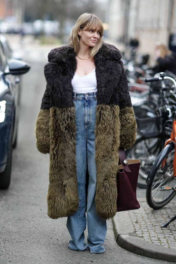 ボリュームのあるロングファーコートも、ハイライズのデニム合わせで縦ラインを強調してすっきりと。Uネックトップスの曲線と柔らかなファーを共鳴させ、フェミニンカジュアルを体現。