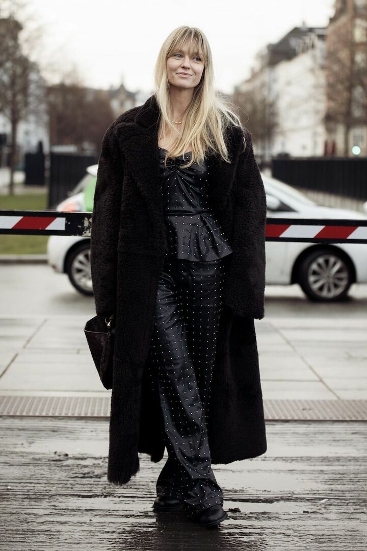 トップスからシューズまで黒で繋いだ装いは、ぷくっとしたパファーキルティングミニスカートがアイキャッチに。ボリュームたっぷりの白ロングファーコートのぬくもりに包まれて、強さと甘さを共存させて。