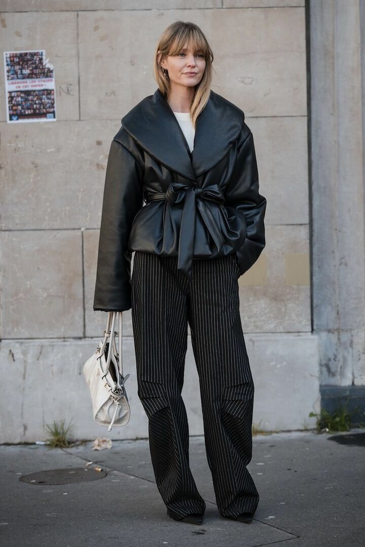 レザーとピンストライプで奥行きを生み出し、ワンカラーの間延びを解消。中綿入りのふっくらとしたブルゾンは、ウエストをベルトマークしてシルエットにメリハリを。ハンサムとフェミニンを両立させた、計算されたブラックスタイルです。