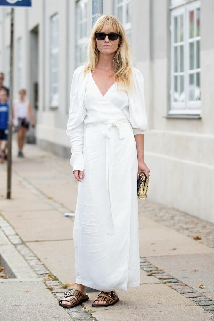 ピュア感漂う真っ白なカシュクールワンピースを、フラットサンダルでカジュアルダウン。サンダルのモノグラムとメタリックゴールドのクラッチが都会派ムードをキープ。