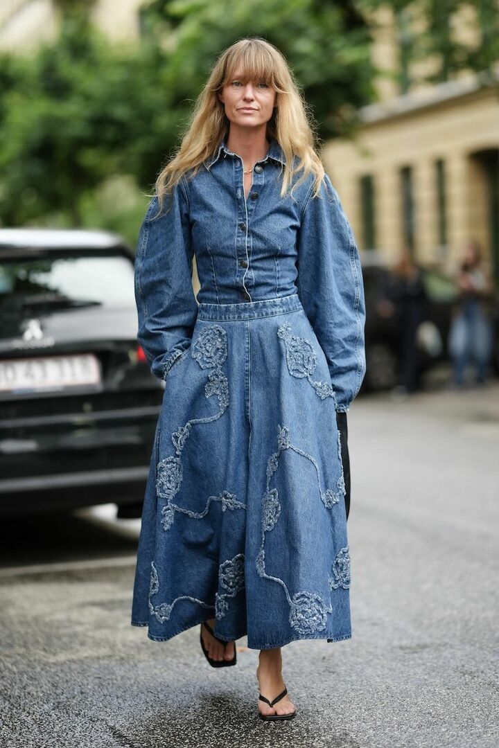 ボリュームフレアスリーブのシャツとドラマティックなフレアスカートというフェミニンなセットアップも、慣れ親しんだデニム素材に任せれば甘くなりすぎず好都合。この日もトングサンダルで足元の力を抜いて。