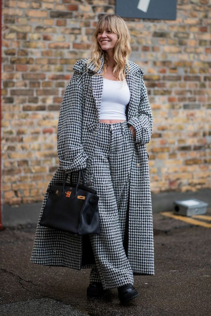 千鳥格子柄がフェミニンなコートとパンツのセットアップは、迫力のあるビッグシルエットなら甘く偏りすぎず、モードを両立できます。コンパクトな白トップスとシックな黒レザー小物を掛け合わせ、抑揚をつけました。