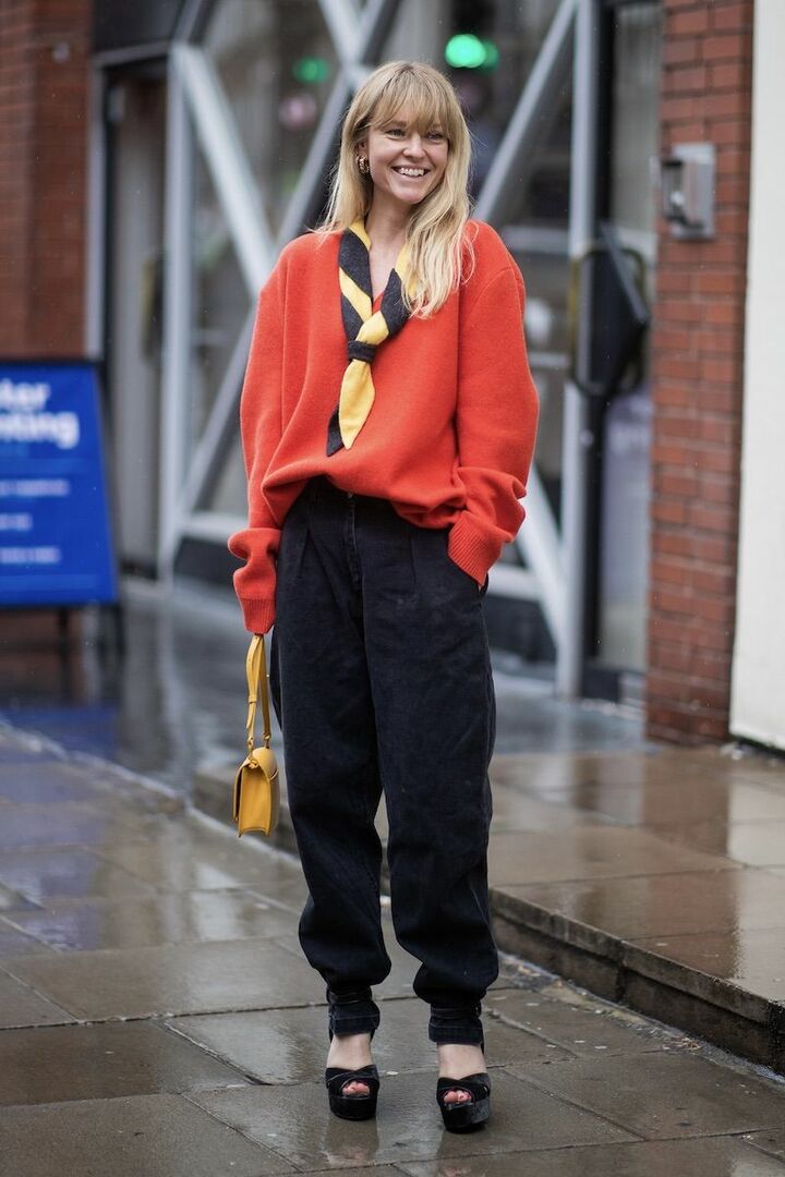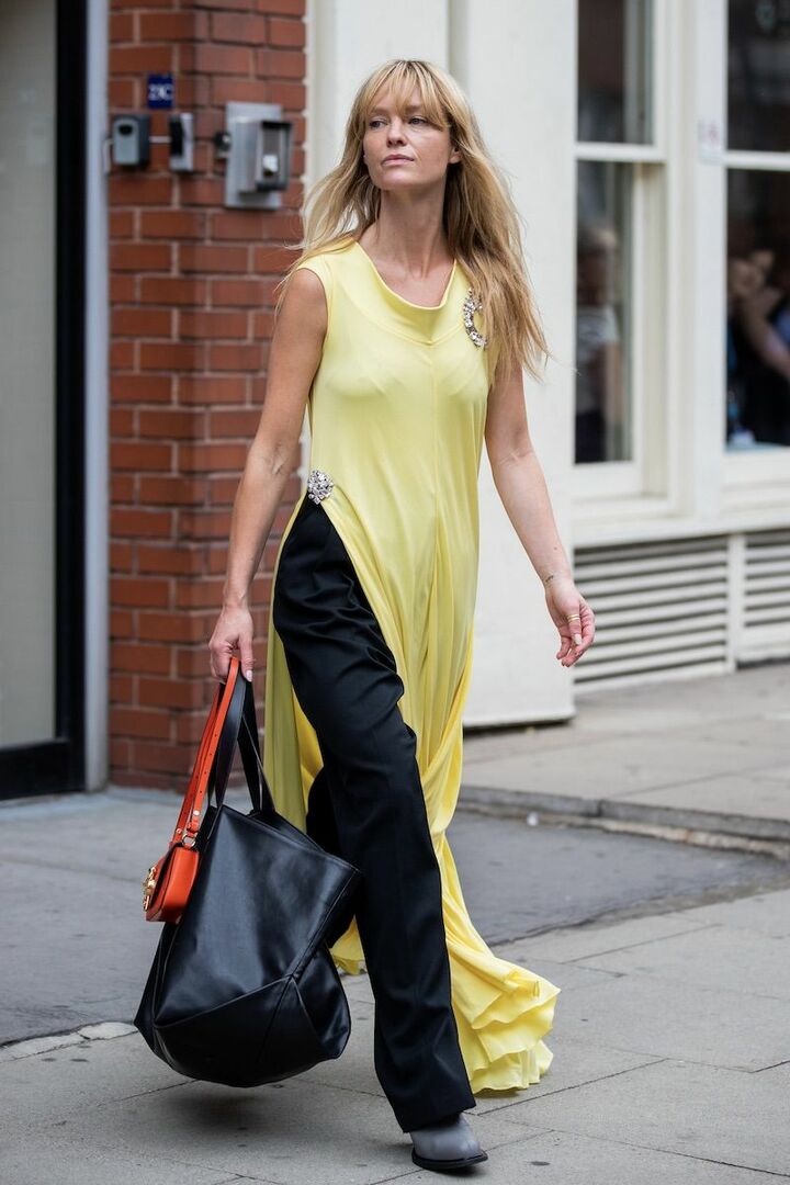 黒パンツのシャープさを引き立てるような、大胆なスリット入りのイエローワンピースをレイヤード。揺れる裾が、さりげないフェミニンを醸します。ステートメントなビッグバッグに鮮やかな赤のミニバッグを添え、さりげなくカラーブロックスタイルへ。