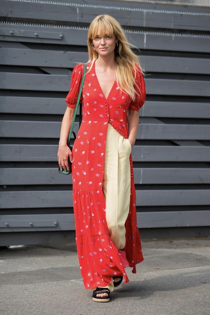 一枚で完結する赤の小花柄ワンピースは、ボタンをたっぷり外してイエローパンツをレイヤード。プレイフルなカラーブロックスタイルも、淡いパンツとなら印象がきつくなりません。フラットサンダルを迎え、足元はリラックス。