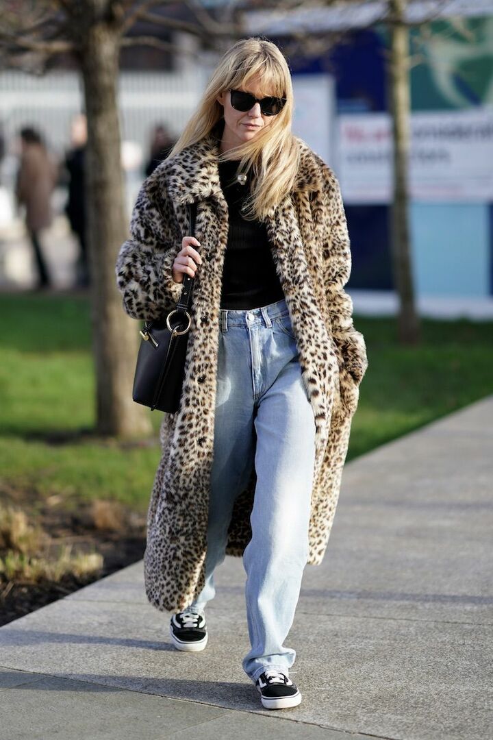レオパードコート、デニムパンツ、スニーカーの強気なストリートカジュアルスタイル。コートの肩を落としたゆるいシルエット、ファー素材の柔らかな質感が作用して、フェミニンな余韻が残ります。