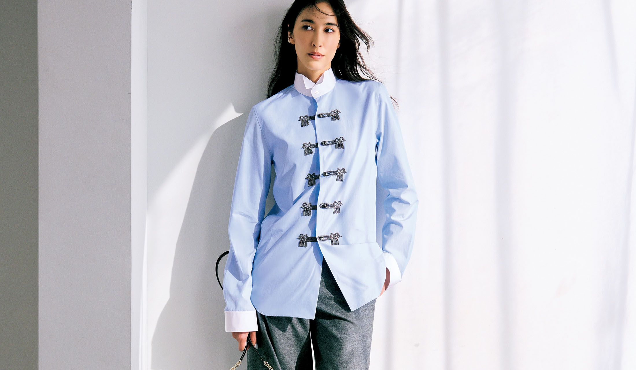 ムッシュ ディオールが深く憧れた、フランス革命と18世紀のスタイルから着想を得た今季の「ディオール」。クラシカルなブランデンブルク刺繍が施されたブルーシャツは、タイトでもルーズでもない、絶妙な身幅と袖幅が端正な一枚。グレーのストレートパンツにタックアウトで合わせて。