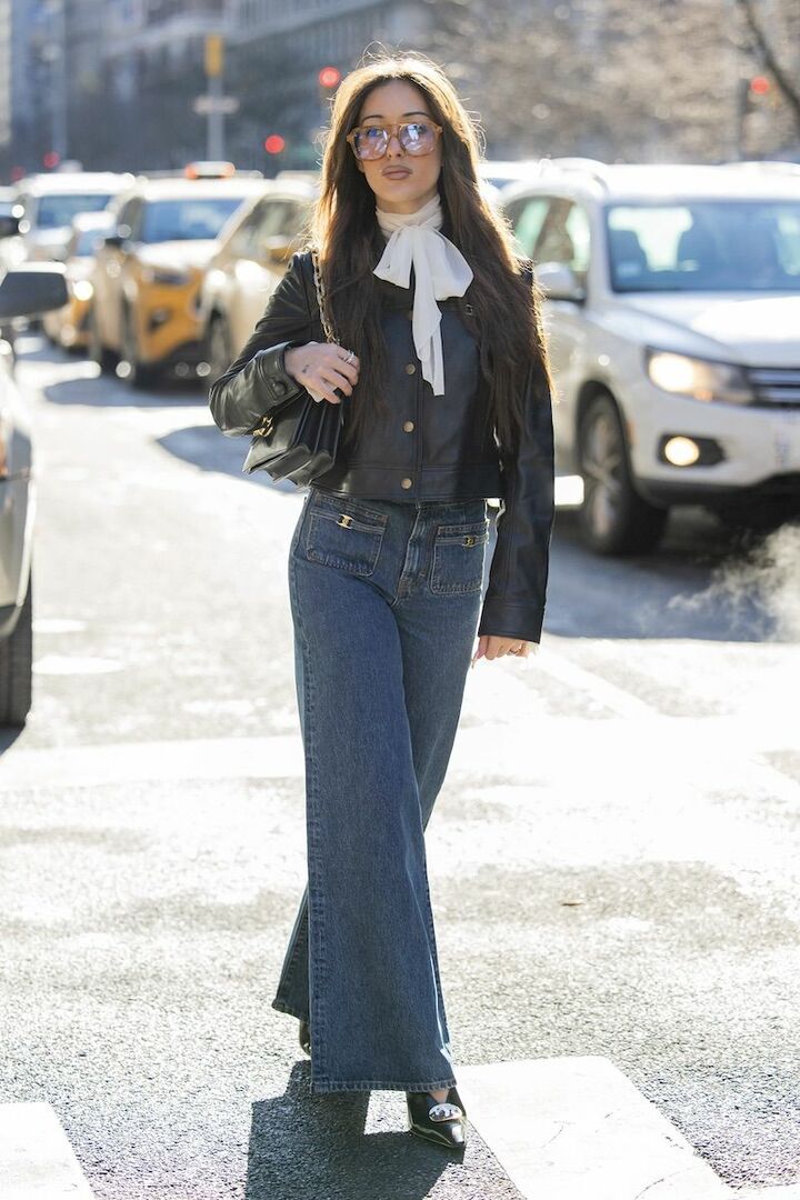揺れる白のブラウスと、ブルーフレアデニムパンツを合わせたフェミニンコーディネート。大人らしさを叶えるために、かりっと引き締まる黒レザージャケットをレイヤード。短丈ならきちんと感を両立でき、ジャケットだけ浮く心配もありません。