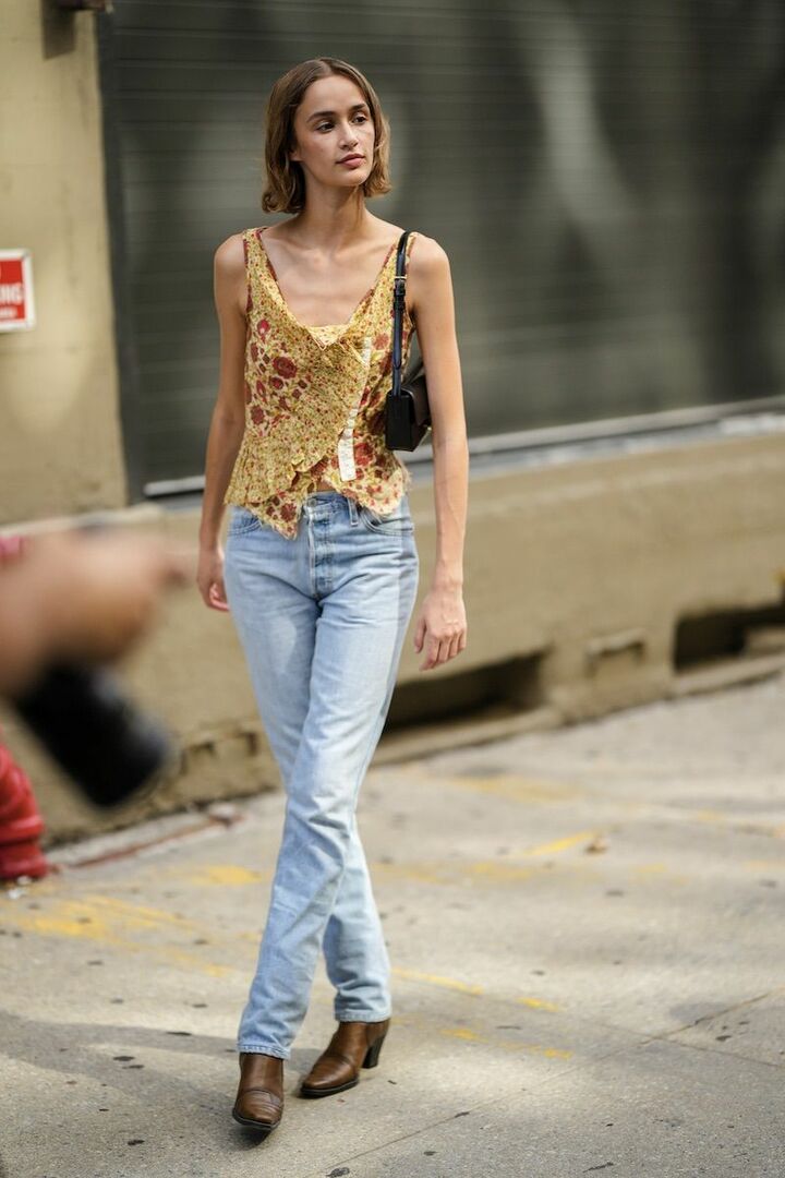 ヴィンテージ調のフラワープリントトップスに寄り添うのは、スリムなスキニーデニムパンツ。アイスブルーを選ぶと、甘さのなかに爽やかさが加わりトゥーマッチになりません。黒とブラウンの小物で引き締め、大人らしさを共存。