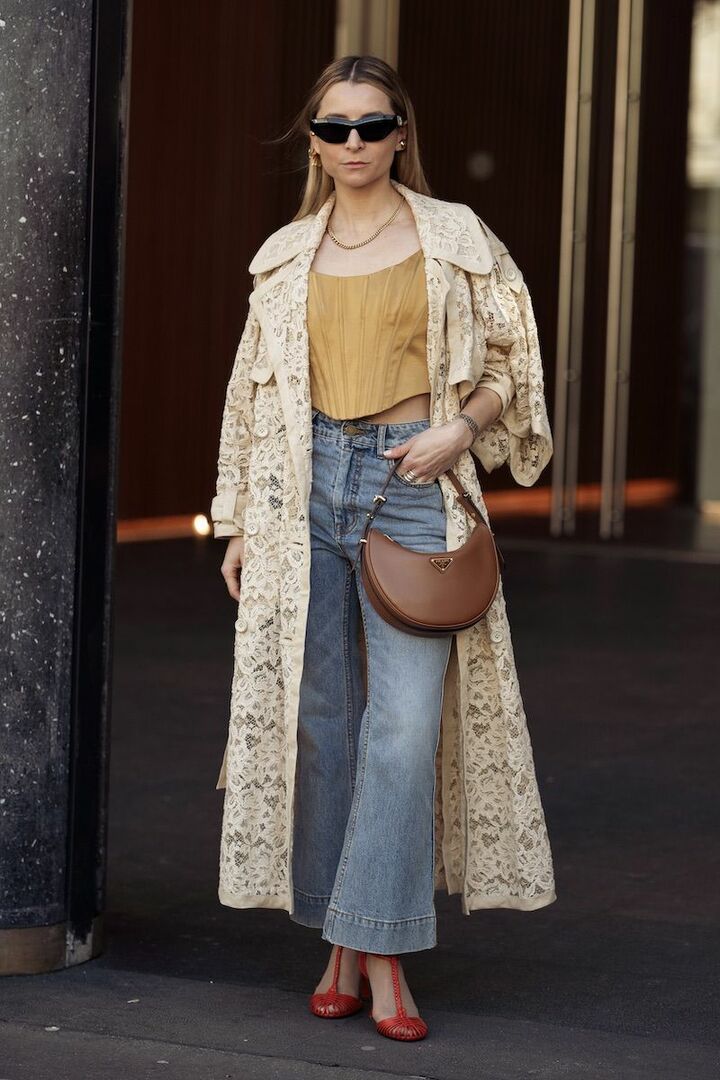 ビスチェとレーストレンチコート、フレアパンツを合わせた高揚感漂うフェミニンコーディネート。華やかなアイテムを重ねながらも、ボトムをデニム素材にすれば気負いないバランスに着地。ふんわりワントーンのなかで、鮮やかな赤パンプスがよく映えて。