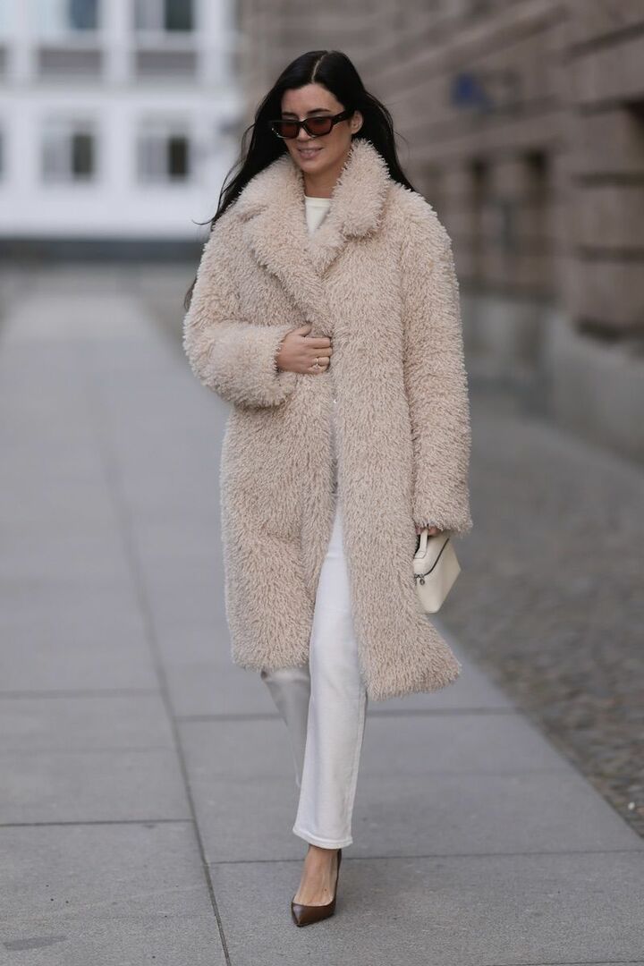 ふんわりとした質感のピンクベージュコートが、冬の装いにぬくもりとフェミニンムードを授けてくれます。ストレートの白デニムパンツで縦のラインをすっきりと強調すれば、甘さを含んだアウターもシャープに映えて大人顔。