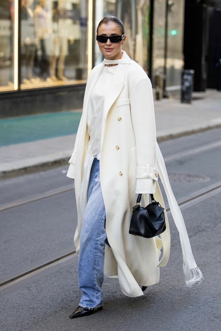 フリルのディテールがフェミニンな、風をはらむブラウスを着用していたアレッサンドラ・アンブロジオ。ヌーディなカラーを選び、上品さを両立させて。デニムは白を選び、切れ味よく。セミフレアシルエットがブラウスの揺れ感にフィットしています。