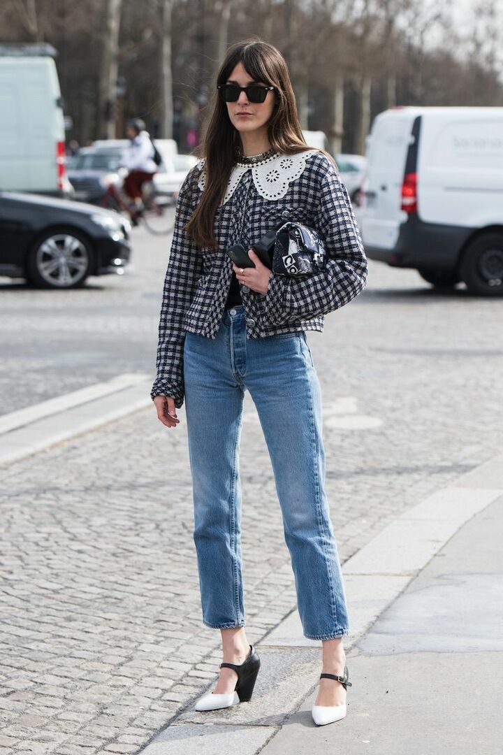 チェック柄のジャケットに、白レースの付け襟を重ねロマンティックに浸って。抜け感たっぷりなクロップドデニムパンツを合わせているからこそ、甘い組み合わせも身近な存在に。仕上げはバイカラーパンプスで、シックなエッセンスを。