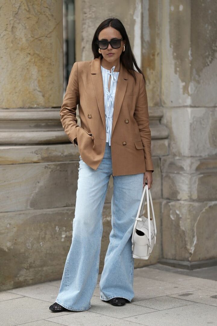 ストライプ模様のブラウスと端正なダブルブレストジャケットで直線を意識し、フレアデニムパンツの曲線を引き立てて。ライトブルー×キャメルの優しい配色が、全体を柔らかく見せてくれます。