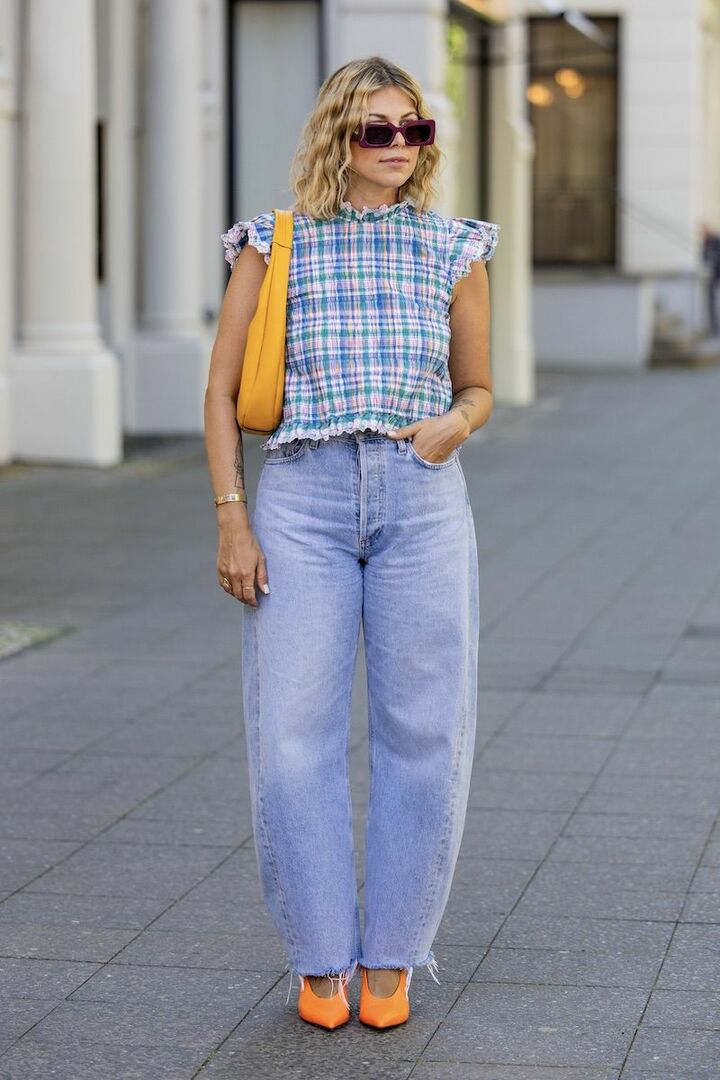 フリルやチェック柄の甘さを、ストレート寄りのワイドデニムで受け止めてカジュアルミックスに。ぱきっとした鮮やかなネオンカラー小物を効かせ、キレのある表情へと導いて。