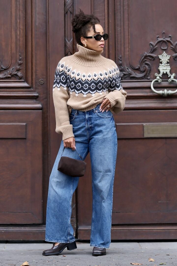 身体を包み込むようなハイネックのノルディック柄ニットと、セミフレアのデニムパンツ。カジュアルワンツーも、シルエットにこだわれば柔らかくしなやか。素材を変えたビターブラウンの小物を添え、穏やかに引き締めました。