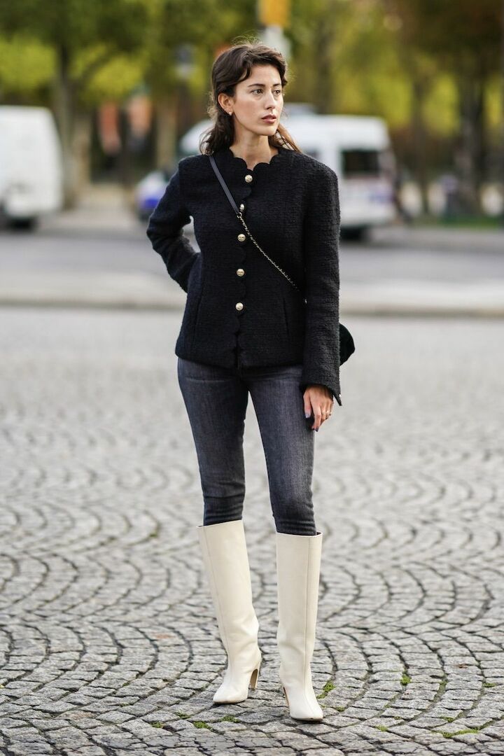 スキニーデニムでレッグラインの曲線を浮かび上がらせ、柔らかく。丸みのあるノーカラージャケットを添えてモノトーンの辛さを和らげ、品のある印象に導きました。ブーツは潔い白を指名し、モード感をひとさじ。