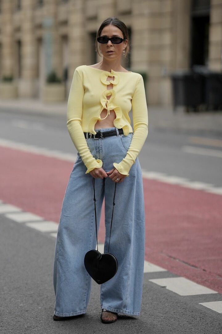 コンパクトな形とフリルの装飾、柔らかなレモンイエロー。甘口なトップスは、ゆったりとしたデニムパンツで程よくカジュアルダウンすると身近な存在に。色のトーンを揃えたら、黒小物でコントラストを授け小気味よく。