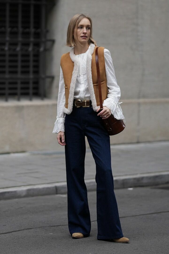 レースのカラーやカフスが印象的な白ブラウスに、シアリングベストを重ねて愛らしく。そんなフェミニンを引き締めるのは、凛としたインディゴブルーのフレアデニムパンツです。端正さとフェミニティを持ち合わせた、ハイブリッドな一枚。