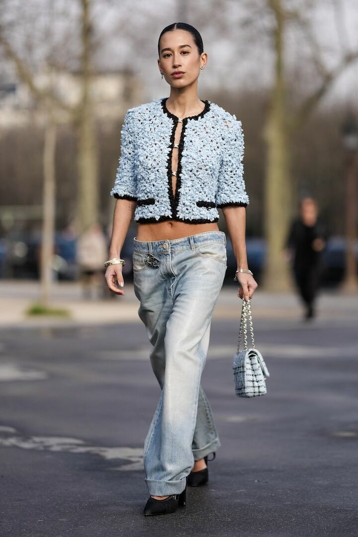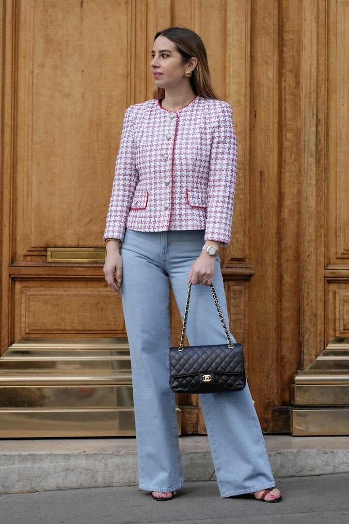 ツイードジャケットとフレアデニムパンツの上品アイテムを軸にして、ピンクとライトブルーの甘い配色が幼くならないように調整。さらに黒のキルティングレザーバッグを添え、シックなムードを後押し。