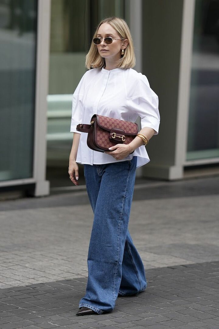 清楚な白ブラウスの広がりを受け止める、まるで器のような存在のブルーワイドデニムパンツ。上下に余白を持たせれば、優雅さと抜け感の両方が手に入ります。ワインレッドのバッグとシャープなパンプスを引き締め役として投入。