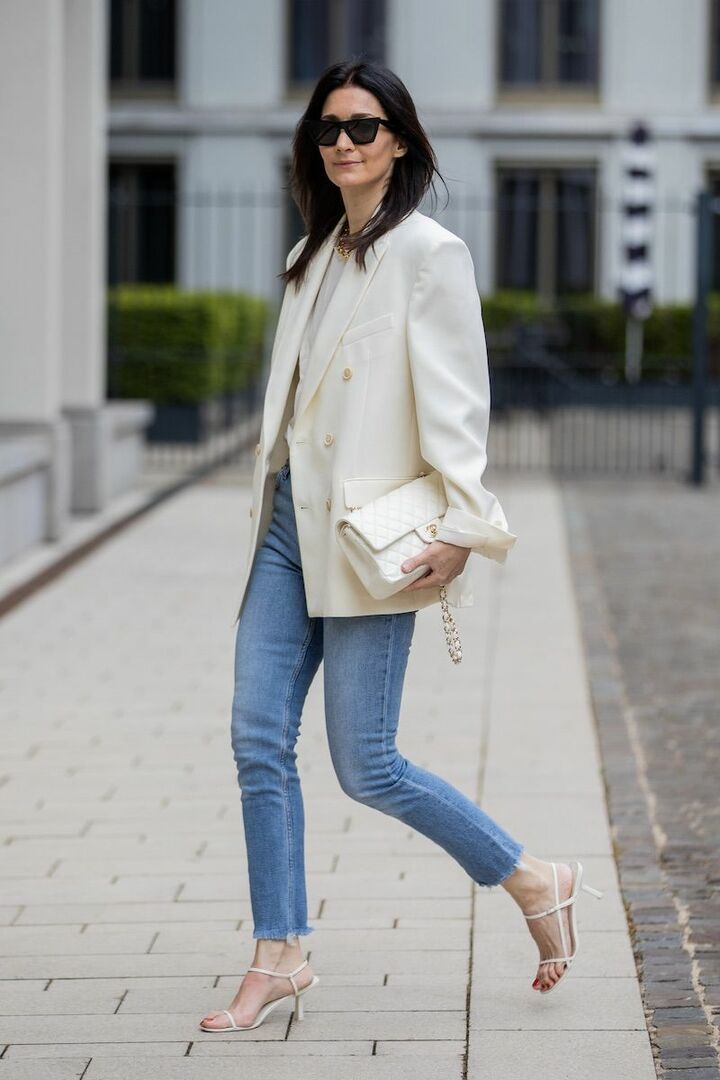 スキニーデニムパンツの延長線上に華奢なストラップサンダルを合わせ、レディなムードを後押し。オーバーサイズのジャケットを合わせれば、メリハリシルエットが生まれて優雅な印象に。さらに白とライトブルーの配色が清楚なムードを盛り上げます。