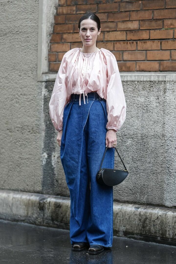 淡いピンクやボリュームスリーブ、光沢のある素材が華やかなブラウスを使って、春の高揚感を表現。しっかりとした生地感と直線的なワイドデニムパンツで重みを足し、ドレッシーなトップスをデイリーに引き寄せ。