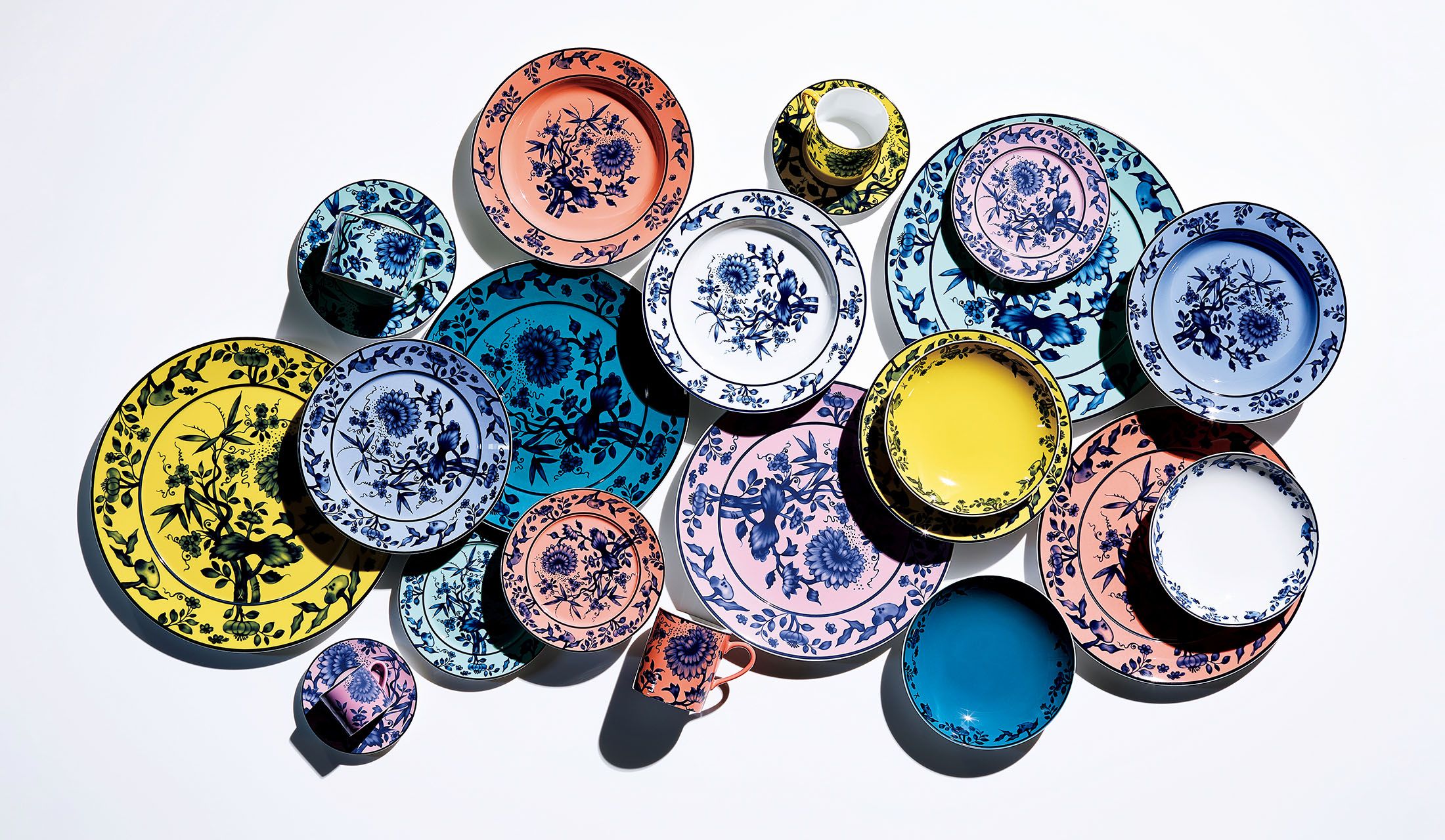 『オリジナル』コレクション1・16・17スーププレート直径約23cm(ブルー、レッド、ホワイト)各¥38,500・2・4・6ボウル直径約18cm各¥27,500(ホワイト、イエロー、ペトロール)・3・7・10プレート直径約29cm(レッド、ピンク、ペトロール)各¥44,000・ 5・11プレート直径約22cm(イエロー、ブルー)各¥25,300・8マグ(レッド)¥27,500・9・12・19プレート直径約17cm(レッド、セラドン、ピンク)各¥15,400・13エスプレッソカップ&ソーサー(ピンク)¥27,500・14・20プレート直径約33cm(イエロー、セラドン)各¥49,500・15カプチーノカップ&ソーサー(セラドン)¥38,500・18コーヒーカップ&ソーサー(イエロー)¥33,000(ジーケージャパンエージェンシー〈マイセン〉)