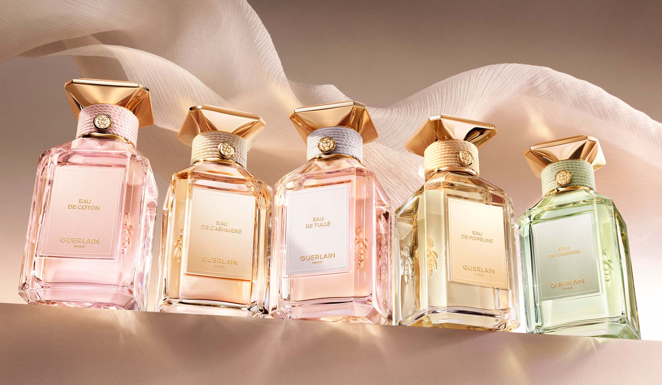 4種のオーデトワレと1種のオーデパルファンで構成された全5種がラインナップ。いずれもホワイトムスクの包み込むようなやわらかさを上質な花々が美しく彩る、エレガントな香りのコンポジションです。