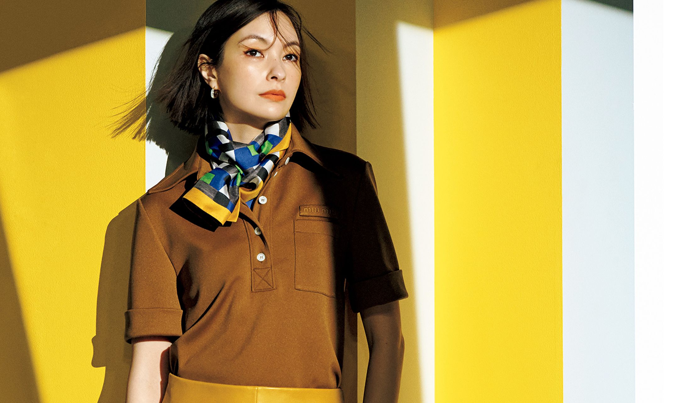 今回はその中から、ブラウンベースにこっくりマスタードを重ね襟元にスカーフでコントラストをつけた「ミュウミュウ」のコーディネートをご紹介します。