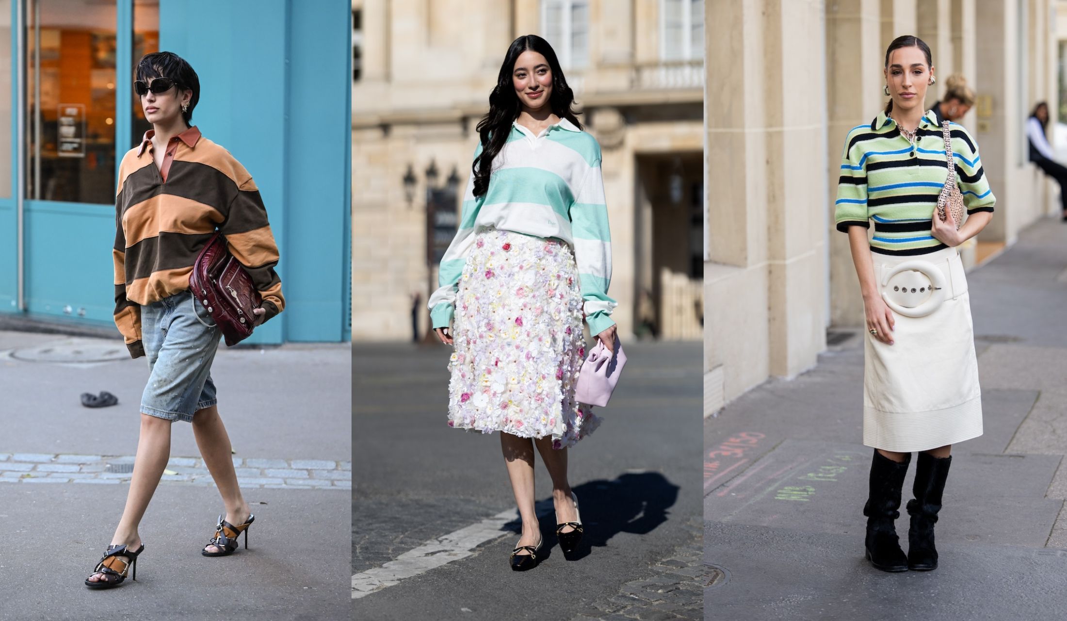 2026年3月5日、同じくパリ・ファッションウィークにて、インフルエンサーのジネヴラ・マヴィラをスナップ。緑×青×白×黒のボーダーポロシャツを纏って登場しました。コントラストの効いたレトロな配色に、クリーミーなホワイトのミディスカートを合わせて洗練度をプラス。レザー素材がラグジュアリーなムードを添え、カジュアルなボーダーをエッジィな格上スタイルへと導いています。