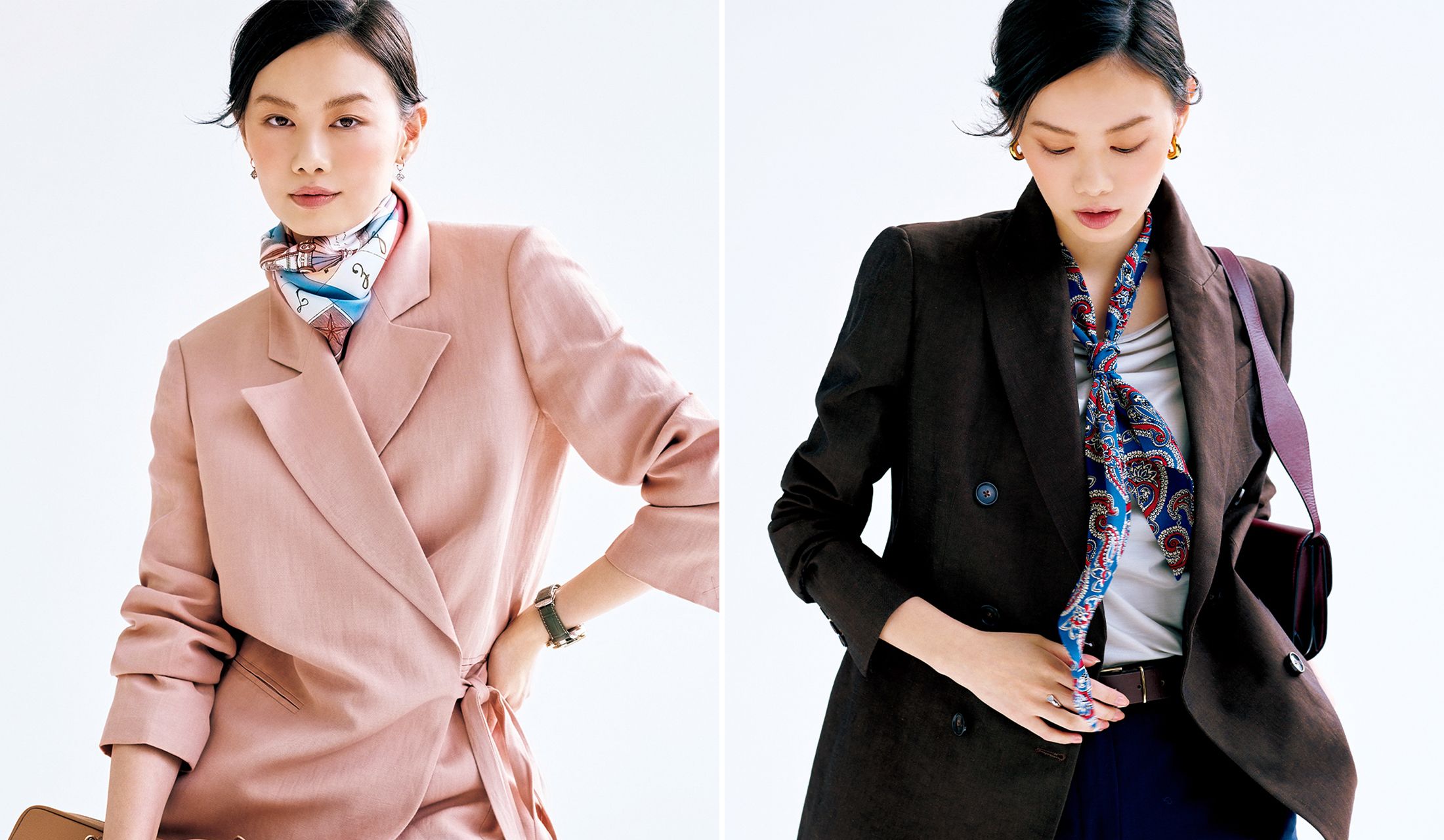 そこで、雑誌『Precious』4月号の特集【最旬テクニックで楽しむ「ジャケットの奥行き」】では、顔周りの印象を左右するVゾーン、バランスを演出するウエストや裾のあしらいに注目。「スカーフ」を効かせた最旬テクニックをお届けしました。