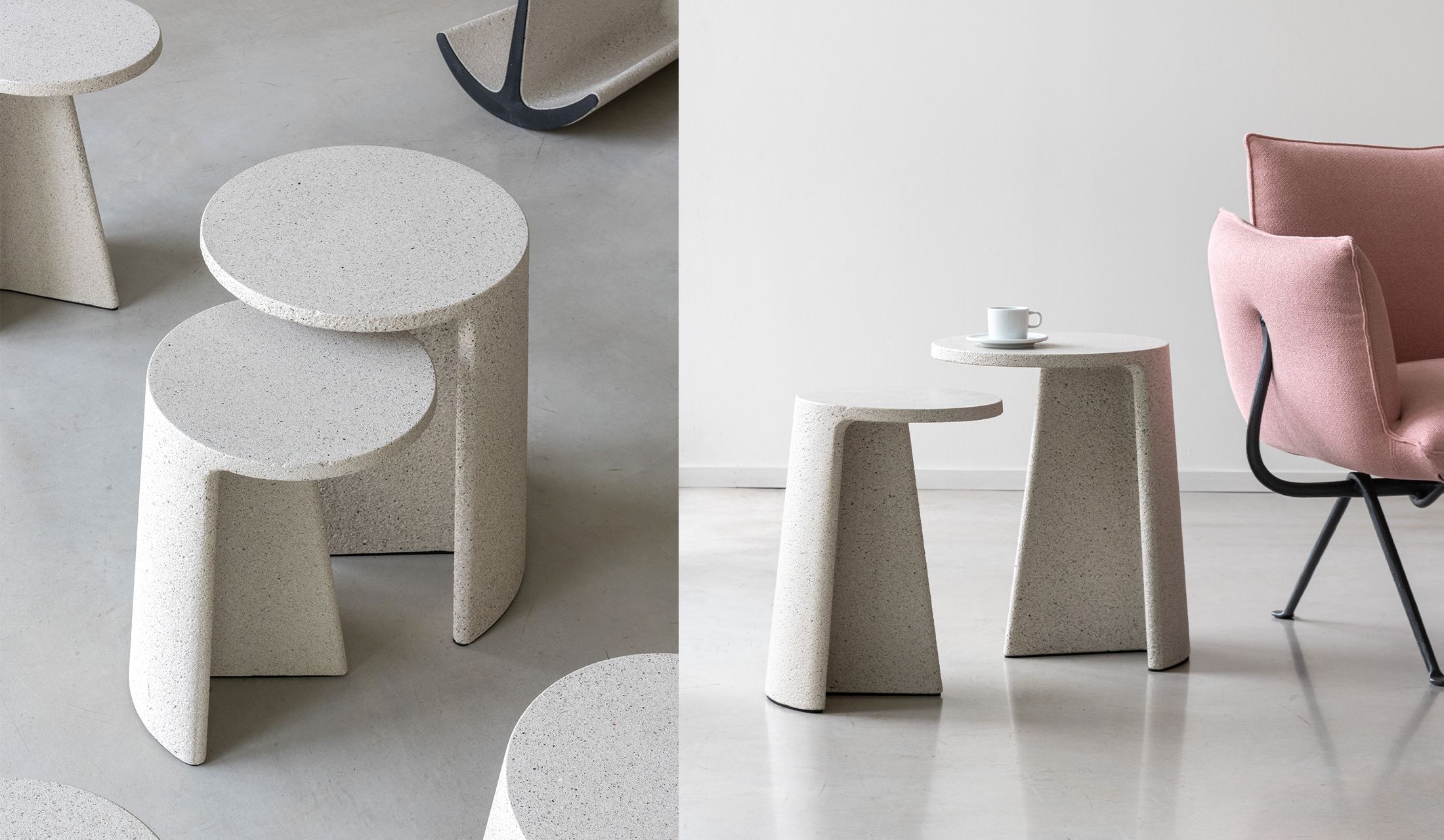 『アンコラ』は、“生のコンクリート”をそのまま用いたテーブルです。とはいえ、ただ粗野な素材というわけではありません。コンクリートは、仕上げの磨き方によって大きく表情を変える素材でもあります。