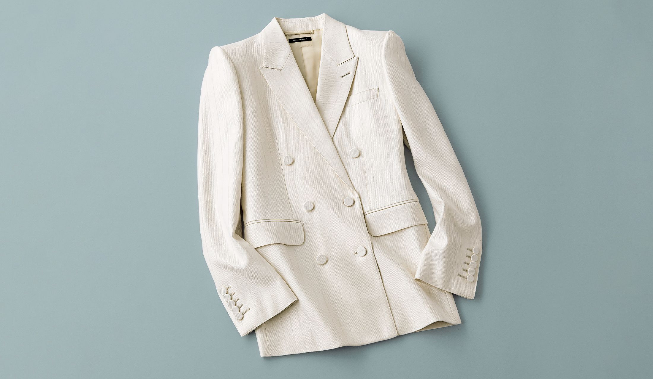 オフホワイトのシャドウストライプのウールシルク素材が爽やかな気品と澄んだモード感を醸すダブルブレストのピークドラペルジャケット。ジャケットになじむくるみボタンなので、合わせるジュエリーを選ばないのも優秀。
