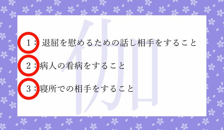 ・伽(とぎ)…退屈をなぐさめるための話相手になる/看病する/寝所でも相手をする