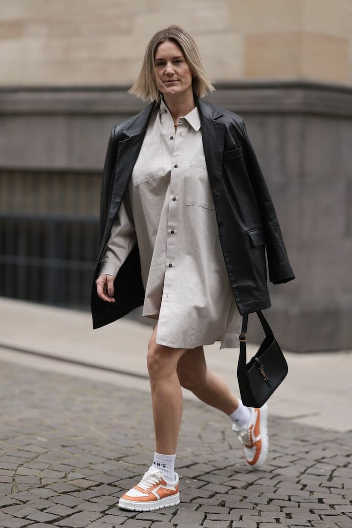ミニシャツワンピースに、靴下とスニーカーを合わせヘルシーに。オレンジのスニーカーが装いをフレッシュに彩ります。幼さをセーブするために、ジャケットとバッグは辛口な黒レザーをセレクト。