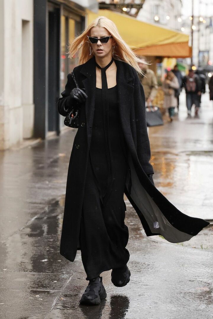 ノースリーブワンピース×スニーカーの軽やかスタイルを、黒によってシックに導いたアシュリー・ロバーツ。サテンとスエードの異素材ミックスなら、ワンカラーでも立体的。バッグの煌めきが作用して、グラマラスに着地。