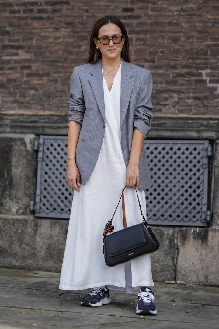 爽やかな白のVネックリネンワンピースに、ネイビースニーカーを合わせ軽快さを演出。シンプルなローテクスニーカーにすると、スリット入りワンピースのキレの良さが引き立ちます。さらにグレーのジャケットを重ね、大人らしいカジュアルへと昇華。