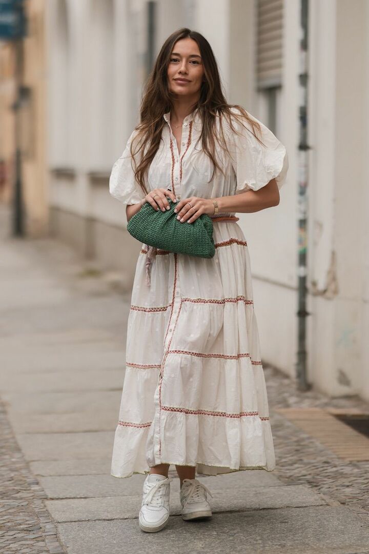 ハシゴレースやフレアシルエット、ボリュームスリーブのワンピースは、ボリューミィなロング丈で華やかさを後押し。ロマンティックなアイテムも、スニーカーで受け止めれば気負わないバランスに。足元だけ浮かないよう、スニーカーもワンピースと同じ白をセレクト。