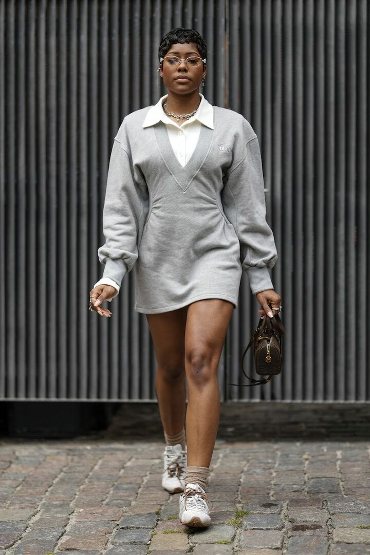 ミニ丈のワンピースは、タイトな形に任せスタイリッシュにシフト。そこに白のバッグとスニーカー、靴下を加え、ミニマルな配色とシルエットにすれば幼く傾きません。