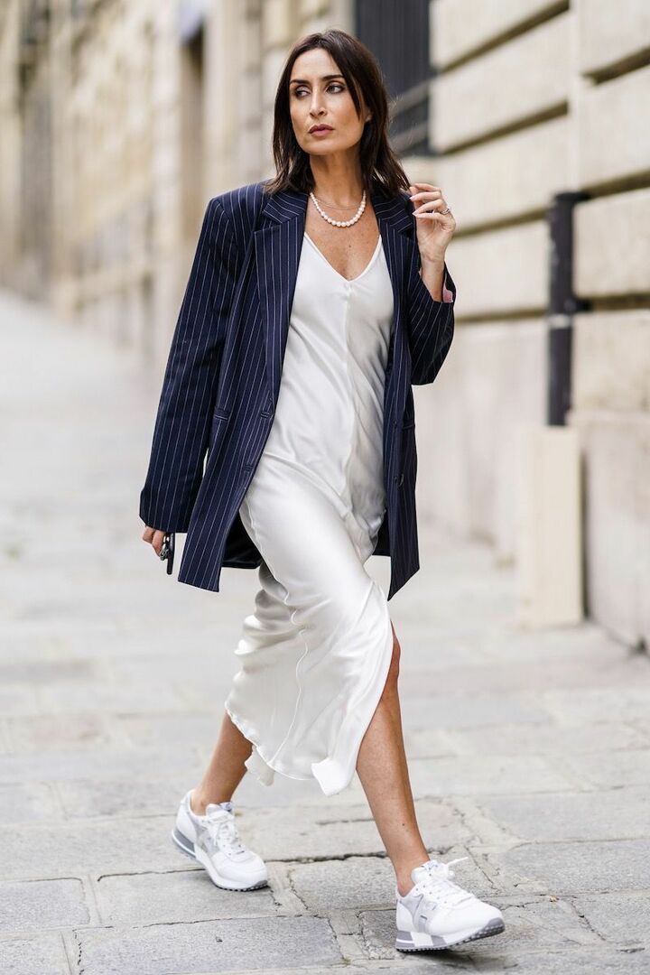 パールネックレスと呼応する瑞々しい表情のサテンワンピースに、ネイビーのストライプジャケットを重ねクリーンさを演出。足元には意外性のあるスニーカーを迎え、大人の余裕を醸して。ワンピースと同じ白ならひと繋がりになり、異なるテイストでも調和が生まれます。