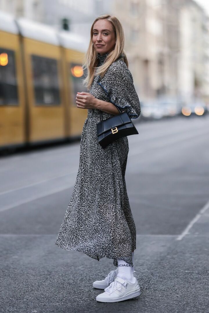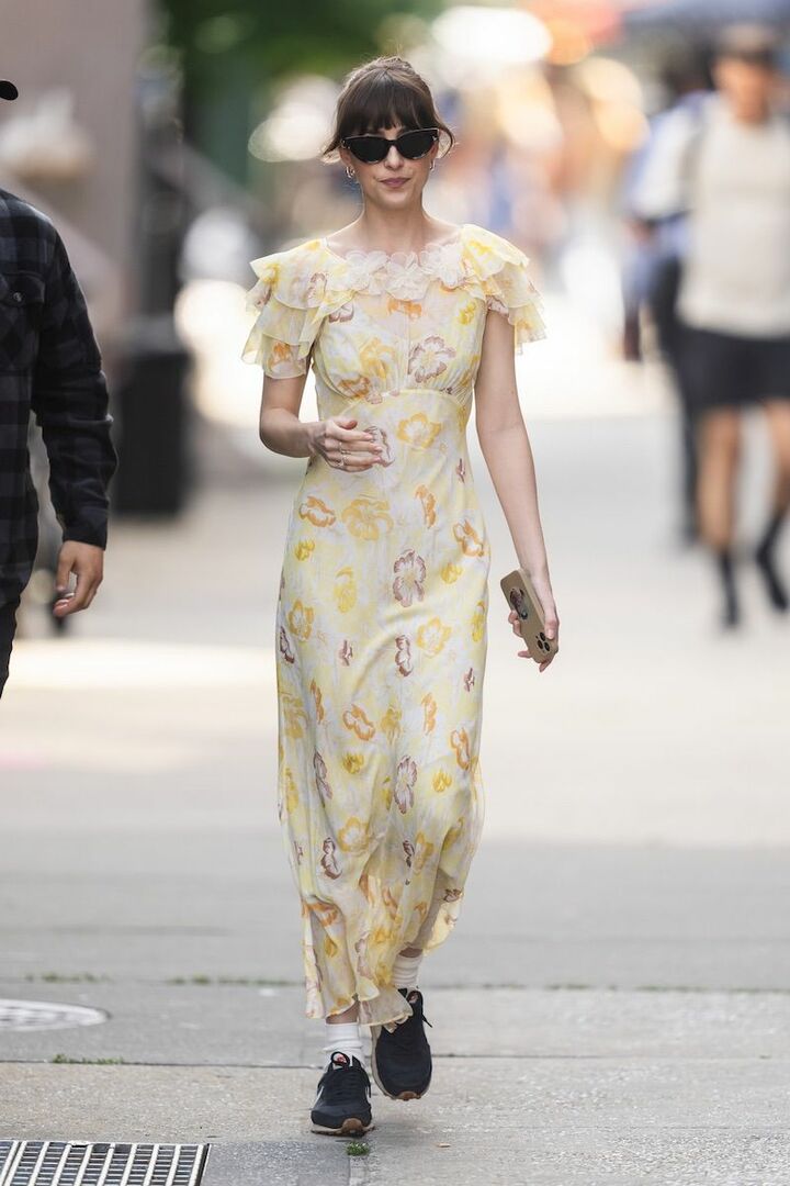 ダコタ・ジョンソンは、レトロな趣漂うパステルカラーの花柄ワンピースと、大人らしさを両立できるネイビースニーカーを合わせたミックススタイルを披露。異なるテイストの橋渡し役として、シンプルプレーンな白靴下を差し込んでいます。