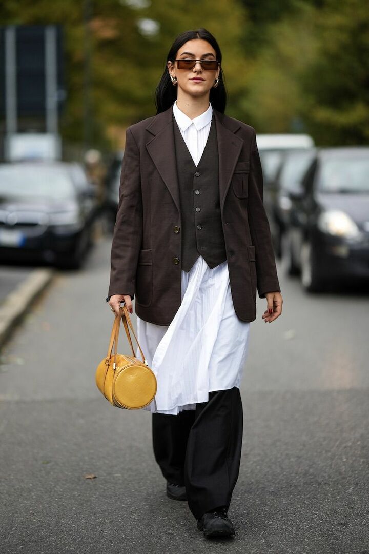 ジレとジャケット、スラックスの紳士な組み合わせに、清楚な白シャツワンピースを忍ばせ奥行きを生み出し、お洒落心を刺激。レイヤードスタイルだからこそ、足元にはパンツとひと繋がりになる黒スニーカーを迎え、シンプルに徹して。