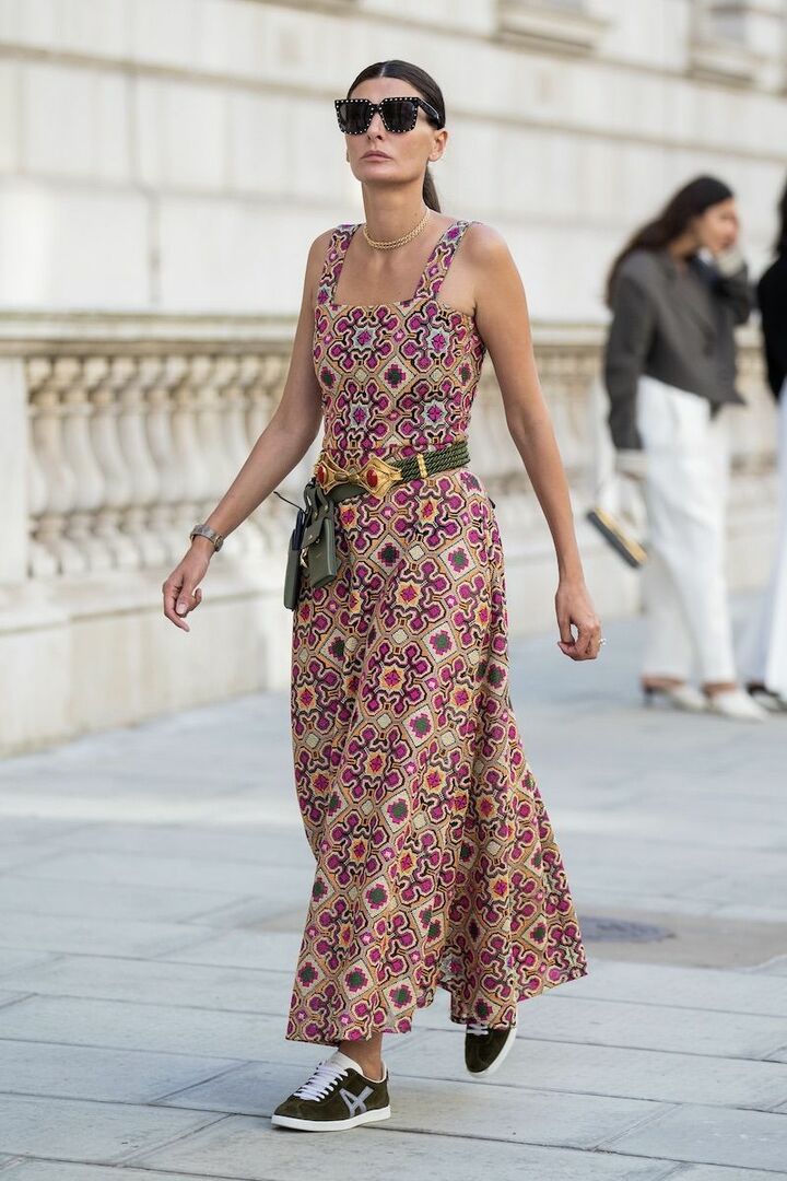 まるでアートのようなカラフルワンピースを主役にした夏スタイル。ベルトバッグでハンズフリーにしながら、ローカットのスニーカーでドレスダウンするとデイリー仕様に。カーキ色でリンクして、シックなムードを両立。