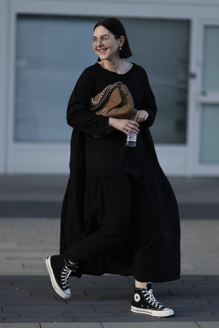 クルーネックとふんわりシルエットがフェミニンなワンピースも、ロング丈の黒、そしてハイカットスニーカーの組み合わせで重厚感を意識すればスタイリッシュに着地。チェーンストラップとキルティングボディのブラウンバッグを添え、リズムをプラス。
