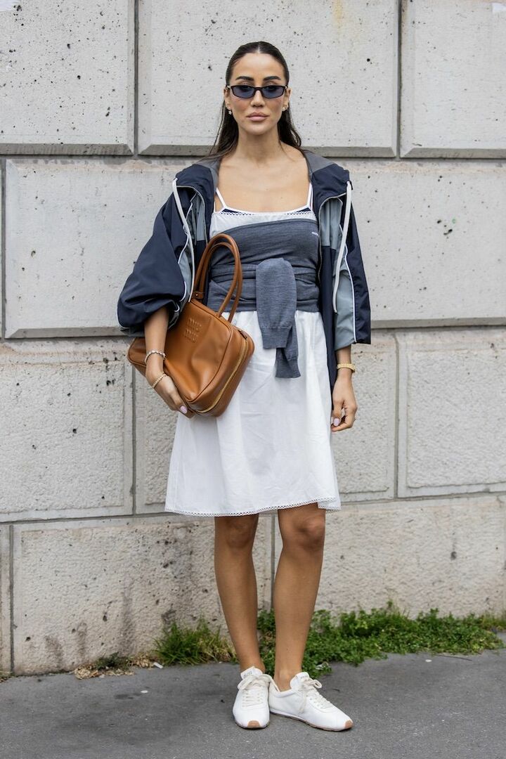 ニットビスチェを重ね、レーストリムが効いた可憐な白ワンピースにメリハリをオン。シャカシャカとしたナイロンブルゾンやスニーカーでアスレジャーミックスにすれば、甘いワンピースも身近な存在に。ネイビー、グレー、白のスタイリッシュな配色を、キャメルバッグでソフトに見せました。