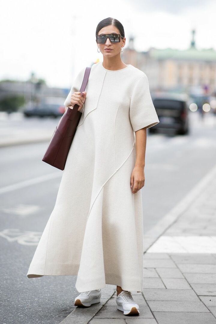 ニットワンピースなど「タイト」なワンピースを合わせ、スニーカーとのコーディネートにスタイルアップ効果をもたらして。縦のラインをきわ立たせ、スマートにまとめましょう。