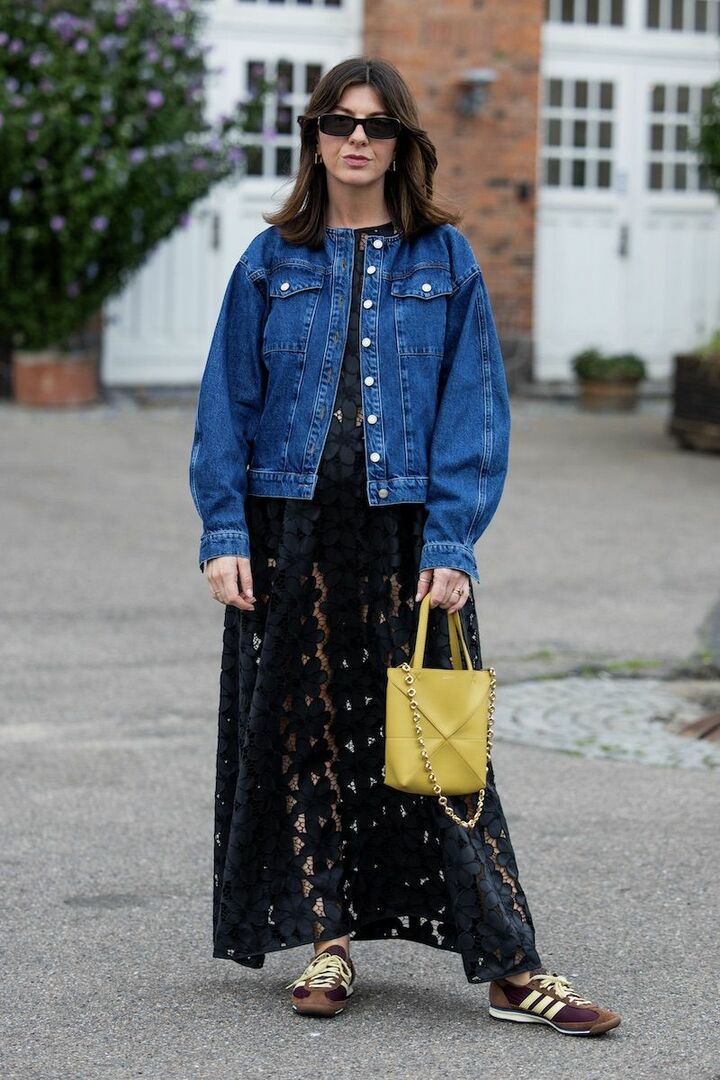 Iラインのワンピースとローテクスニーカーですっきりさせ、黒コーディネートにスタイルアップ効果を上乗せ。オーバーサイズのデニムジャケットをラフに羽織って動きを出し、ダークカラーながらも軽やかな印象に。