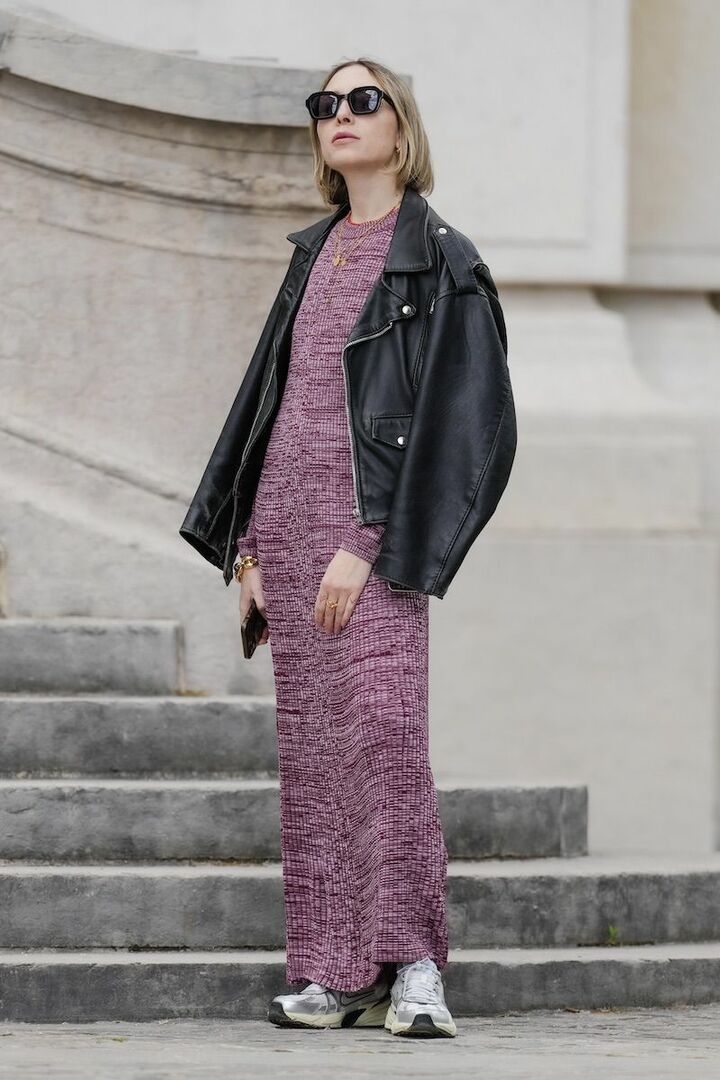 タイトなニットワンピースで縦ラインを強調し、すらりとしたシルエットをメイク。レザージャケットを肩掛けして視線を上へ集めつつ、程よくボリュームのあるグレースニーカーで足元に厚みを出し、メリハリのあるバランスに。