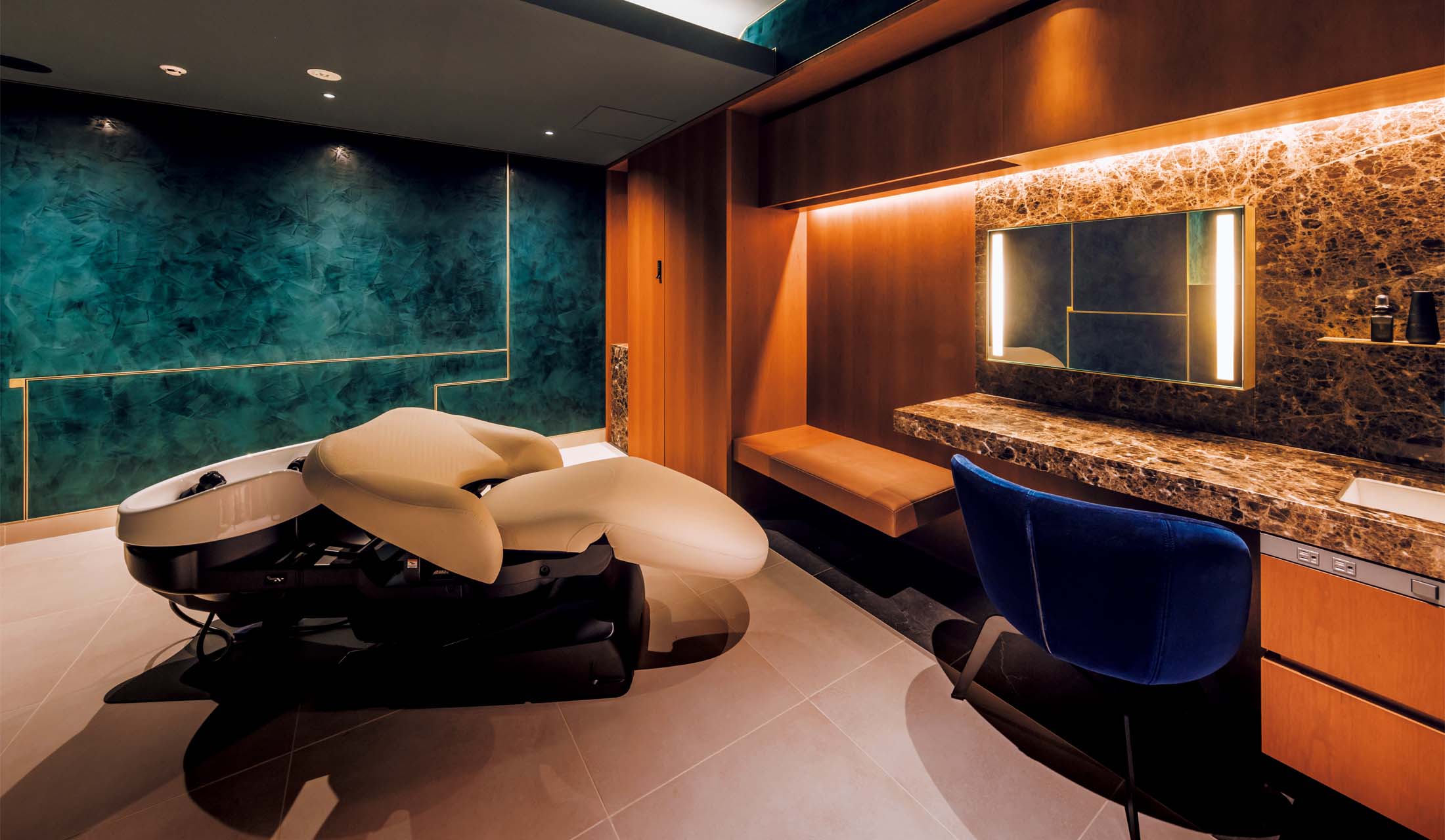 ドイツの深い森を思わせる、落ち着いたプライベート空間でヘッドスキンケアを提供。「緻密な手技と、先端医学のエビデンスに基づく施術が受けられます。癒しとラグジュアリーの両方を味わえる、ホリスティックな施術が魅力」と安倍さん。